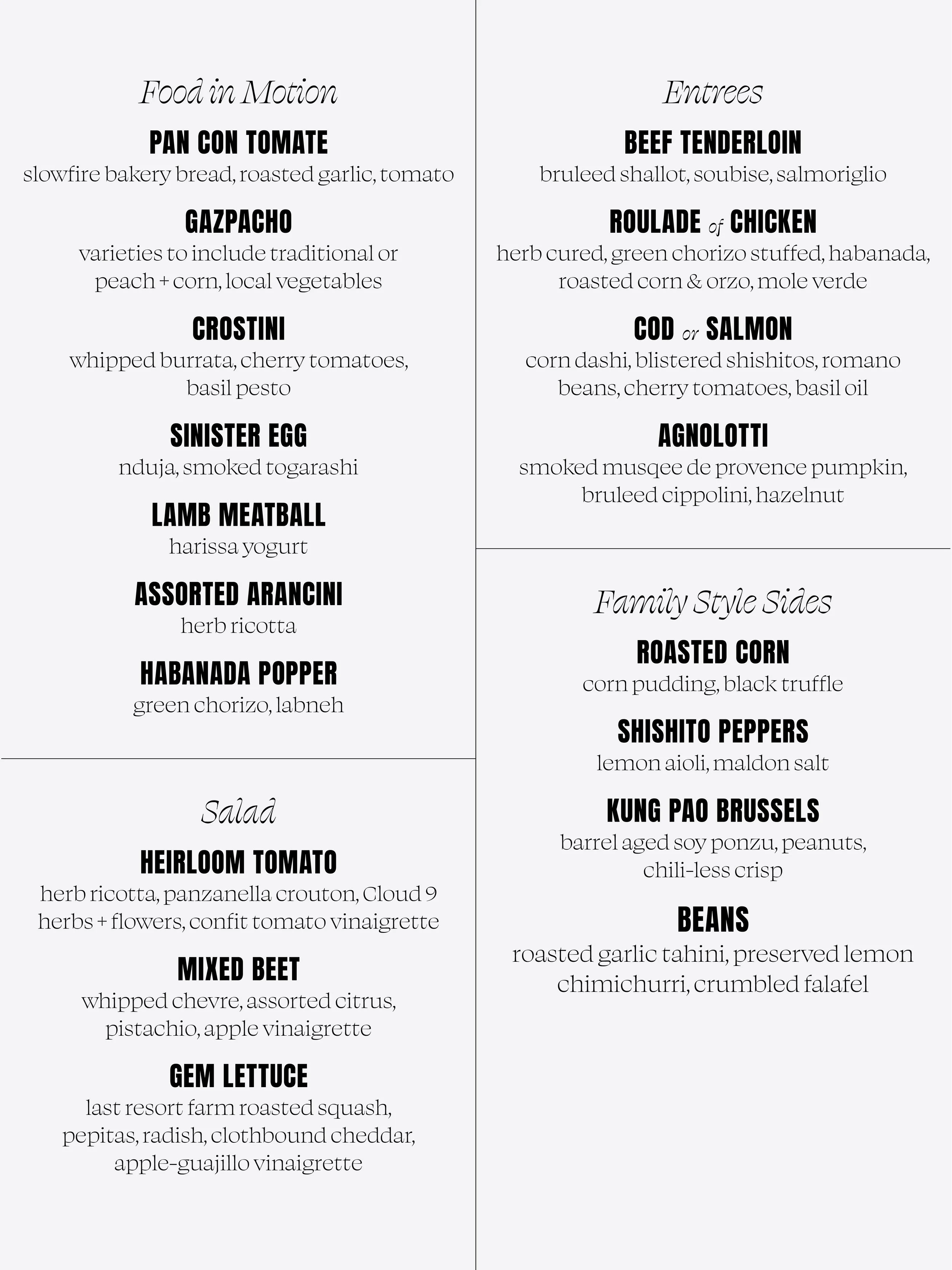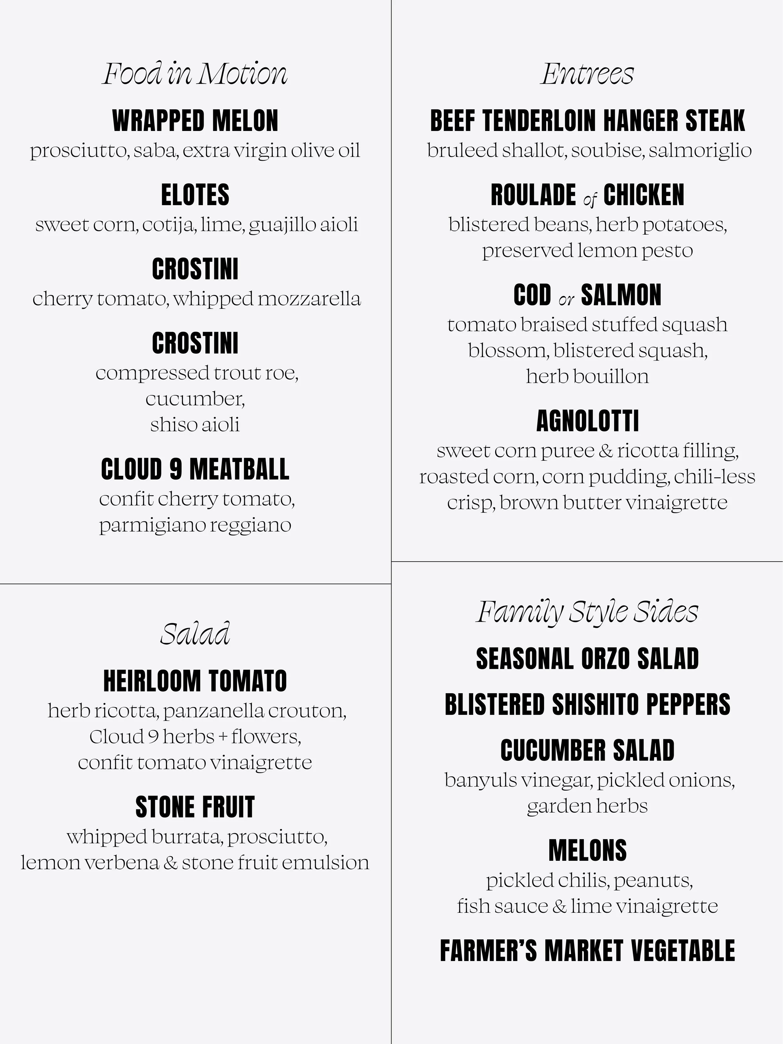 Founded in 1990 by Sarah Moran, Cloud 9 Caterers remains a proud, family-owned Vermont business. After working alongside his mother for five years, Chef Stephen Coggio purchased the company, carrying forward her legacy with a renewed focus on craftsmanship, sustainability, and exceptional hospitality.